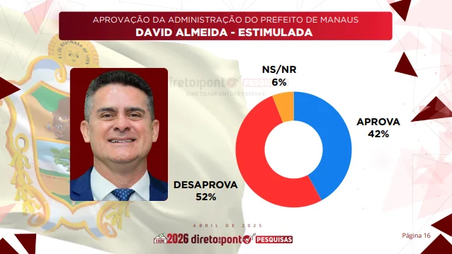 O prefeito de Manaus, David Almeida (Avante), está lidando com um cenário de rejeição maior que aprovação em seu segundo mandato, conforme uma pesquisa realizada pelo Direto ao Ponto Pesquisas, divulgada nesta sexta-feira, 25 de abril. O levantamento revelou que 52% dos entrevistados desaprovam a atual gestão, enquanto apenas 42% a aprovam, e cerca de 6% dos entrevistados não souberam ou não responderam.