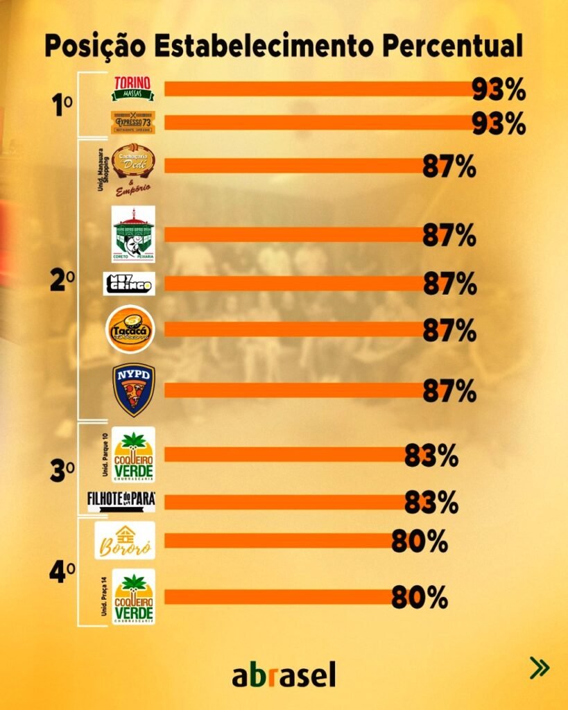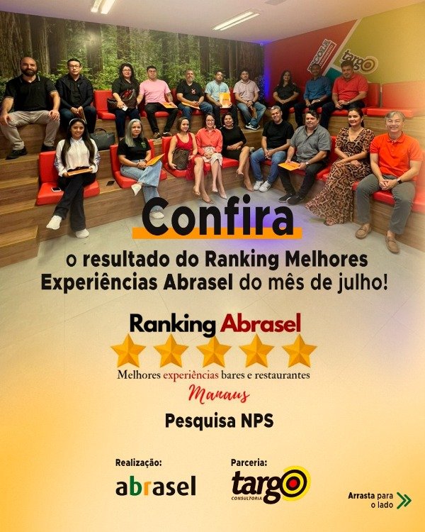 A ação é criação de um ranking das melhores experiências em bares, restaurantes, lanchonetes, cafeterias e similares da alimentação fora do lar, através de pesquisas mensais, da Targo Consultoria, que é a empresa responsável pela sistematização do processo. Para participar deste projeto a empresa precisa ser associada à Abrasel que já tem direito a um valor diferenciado. Para mais informações pelo 92 98292-0021. Conheça a primeira lista do projeto lançada no mês de julho de 2022. Nela temos as primeiras empresas em destaque: