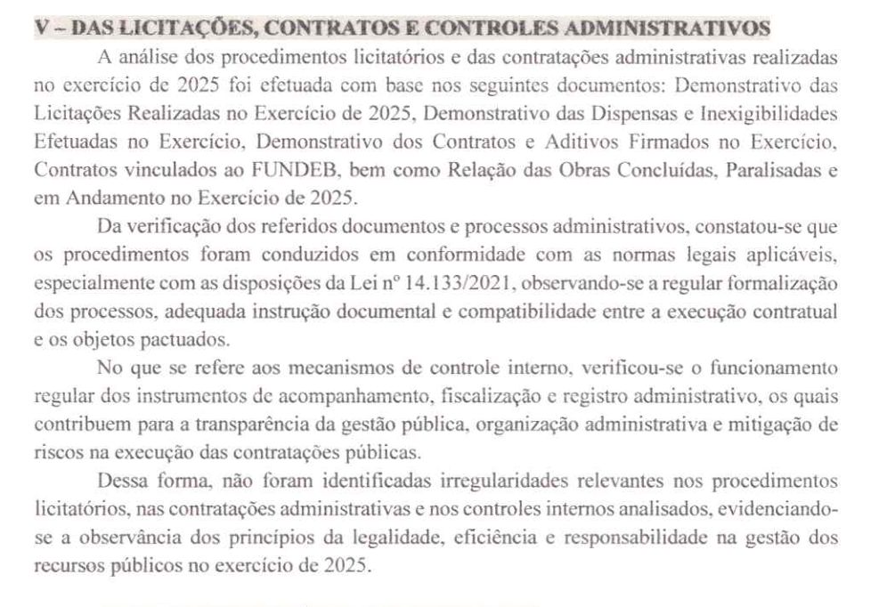Apesar do volume expressivo de contratações diretas, o parecer assinado pelo controlador-geral de Anamã, Edmilson Bruno Granjeiro de Oliveira, opina pela aprovação integral das contas e dos procedimentos administrativos, alegando que os processos foram conduzidos em conformidade com a nova Lei de Licitações (Lei nº 14.133/2021).