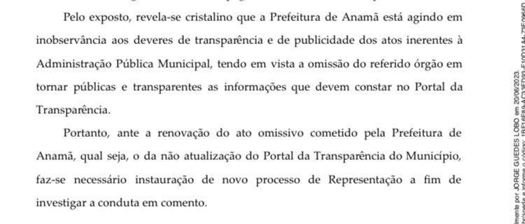 Na nova representação, o TCE-AM chama a prefeitura de Anamã de omissa por conta da falta de atualização do Portal da Transparência do Município e afirma que o Executivo local está agindo em “inobservância aos deveres de transparência e de publicidade”. Por conta disso, a Corte de Contas considera ser necessário o novo processo de representação para investigar a conduta da gestão.