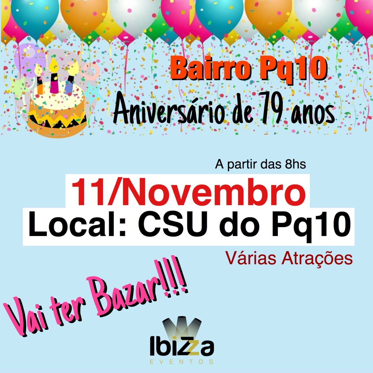 Venha comemorar conosco o ANIVERSÁRIO DO BAIRRO PQ 10, 79 ANOS ?????????????????com várias atrações, atividades, músicas e o Ibizza Eventos trazendo o bazar com mais de 20 lojas pra vc ENLOUQUECER Novos e Seminovos com preços IMBATÍVEIS!!!