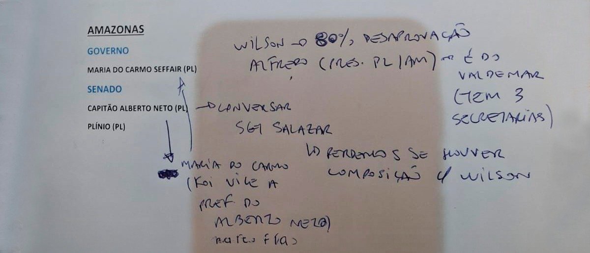 As anotações também registram que Maria do Carmo integrou, como candidata a vice-prefeita, a chapa liderada por Alberto Neto na eleição municipal de 2024, em Manaus. O documento ainda menciona o nome de Alfredo Nascimento, acompanhado da observação “é do Valdemar”, em referência ao presidente nacional do PL, Valdemar Costa Neto, e aponta que o grupo possui influência sobre três secretarias no Estado.