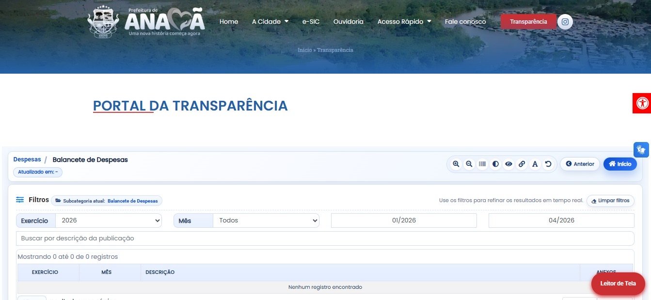 As evidências são claras. Ao consultar o exercício de 2026, o sistema retorna a mensagem: “Nenhum registro encontrado”. O cenário não é diferente para o segundo semestre de 2025. As últimas publicações disponíveis de “Balancetes de Despesas” e “Listagem de Despesas Empenhadas e Liquidadas” datam de agosto de 2025.