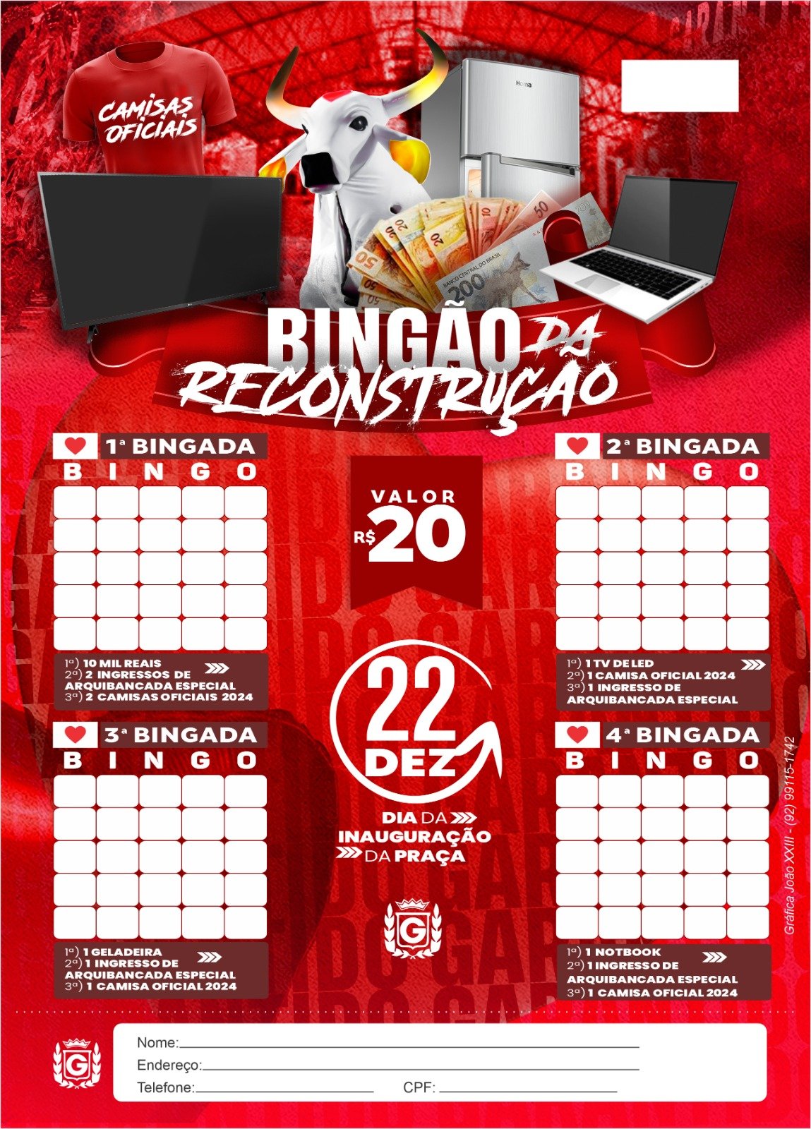 O Bingão da Reconstrução, promovido pela Associação Folclórica Boi Bumbá Garantido, acontece dia 30 deste mês, a partir das 19h e terá quatro bingadas, que sortearão combos de prêmios em cada uma.