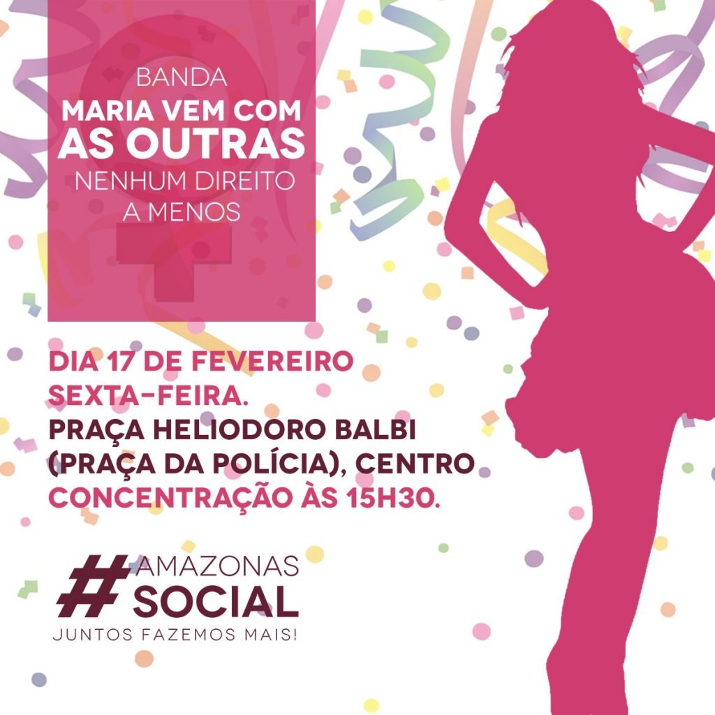 A banda de carnaval “Maria Vem com as Outras”, promovida pela Secretaria Executiva de Política para Mulheres (SEPM) e pelo Conselho Estadual dos Direitos da Mulher (Cedim), chega com mais uma edição no dia 17 de fevereiro, com concentração às 15h30, na praça Heliodoro Balbi (antiga praça da Polícia), Centro. O grito de guerra deste ano é “Nenhum Direito a Menos”. As camisas da banda serão distribuidas de graça no dia do evento.