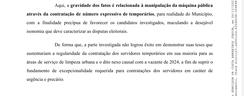 Depoimentos colhidos em juízo consolidaram a tese de desvio de finalidade. Uma das testemunhas afirmou ter sido admitida em agosto de 2024 sem contrato assinado, mediante a promessa de emprego em troca de apoio político aos candidatos investigados. Outro relato indicou a transferência punitiva de servidores concursados que apoiaram a oposição. Para o procurador, “a gravidade dos fatos apurados é excessiva”, uma vez que as condutas comprometeram a igualdade de oportunidades no pleito.