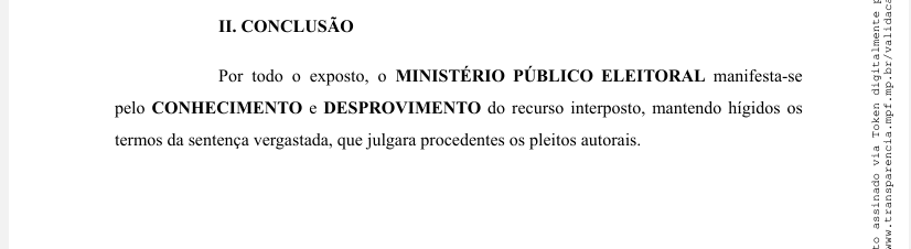 Diante do robusto conjunto probatório, o Ministério Público Eleitoral manifestou-se pelo “conhecimento e desprovimento do recurso interposto, mantendo hígidos os termos da sentença”. A decisão judicial de primeira instância já havia determinado a cassação dos diplomas de Matulinho e Jorge Martins, além de declarar a inelegibilidade de Matulinho e Francisco Andrade por oito anos.