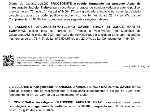 Leia mais: Justiça Eleitoral mantém cassação do prefeito de Caapiranga