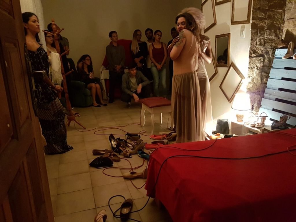 A obra, que tem a duração de uma hora, desenvolve-se nos cômodos habituais, com objetos comuns do cotidiano, onde o público é livre para transitar e interagir. Devido a mesma desenrolar-se em um local tão íntimo (a residência) e de forma tão próxima das intérpretes, proporciona um mister de sensações naqueles que as experimentam, de forma que a dicotomia entre intérprete-criador e plateia inexiste, fazendo com que todos participem como expectador ou atuante.