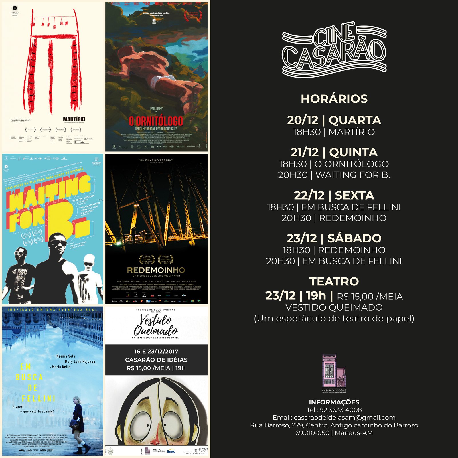 O Cine Casarão desta semana traz grandes novidades para Manaus, quatro filmes e ainda a reapresentação do espetáculo ‘Vestido Queimado’, da Cia Soufllé com Bodó. Preços populares para o cinema e o teatro. Os ingressos custam R$ 10 (inteira) e R$ 5 (meia) com sessões às 18h30 e 20h30.