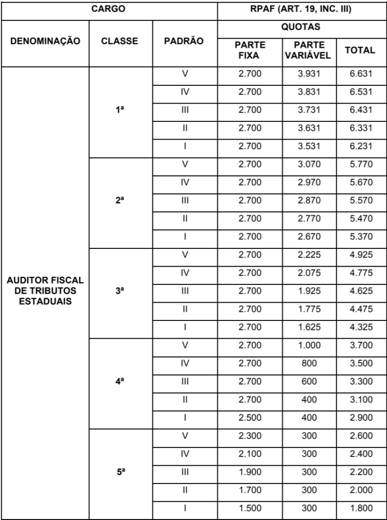 vale registrar que as quotas da lei atualmente vigentes, para o cargo de auditor, iniciam com o valor de 3.200 podendo chegar ao valor de 8.617. No Projeto de Lei, no entanto, essas quotas foram reduzidas para os valores de 1.800 a 6.631.