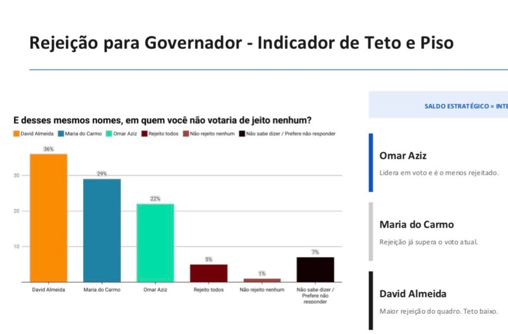 Na pesquisa de intenção de voto estimulada para governador, Omar Aziz lidera com 40%, seguido por Maria do Carmo (23%) e David Almeida (22%). Outros 8% afirmaram que votariam em branco ou anulariam o voto, enquanto 7% não souberam ou preferiram não responder.