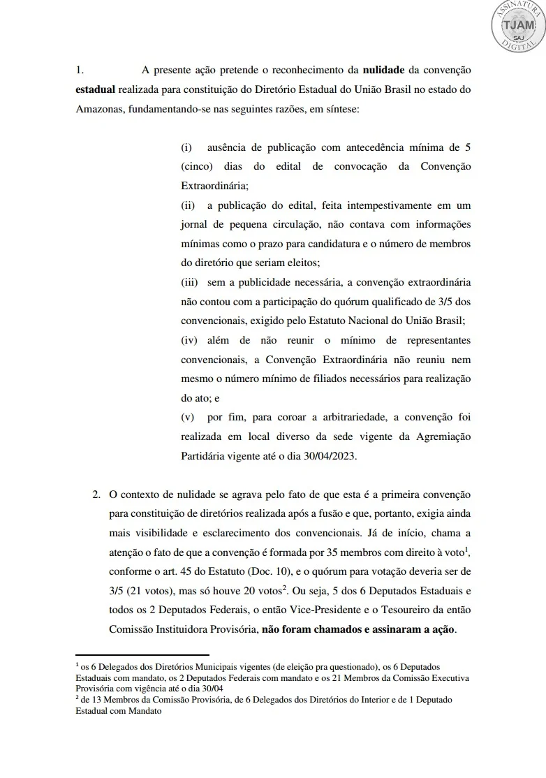 Os sete parlamentares amazonenses do União Brasil, incluindo o presidente da Assembleia Legislativa, Roberto Cidade, assinam ação impetrada na 5ª Vara Cível e de Acidentes de Trabalho na capital, que pede a anulação da Convenção Estadual que transferiu o controle do partido ao ex-deputado e atual secretário de Desenvolvimento Econômico, Ciência, Tecnologia e Inovação, Pauderney Avelino.