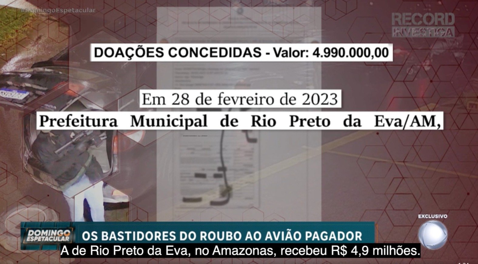 A Prefeitura de Rio Preto da Eva, no Amazonas, foi citada em uma reportagem do programa “Domingo Espetacular”, da TV Record, exibida neste domingo (14). Segundo a investigação da Polícia Federal, o município teria recebido R$ 4 milhões da quadrilha ligada ao PCC, responsável pelo assalto ao avião pagador da Caixa Econômica Federal em julho de 2024, em Caxias do Sul (RS). Na época, a cidade era administrada pelo prefeito Anderson Souza (UB),