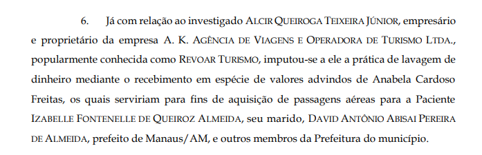 Enquanto outros investigados optaram pelo silêncio, Alcir decidiu falar e confirmou que a ex-chefe de gabinete Anabela Cardoso Freitas era sua cliente. Segundo o empresário, Anabela era responsável por adquirir passagens não apenas para si, mas também para o prefeito David Almeida, para a primeira-dama Izabelle Fontenelle e para familiares, como o sobrinho do mandatário Kássio Almeida.