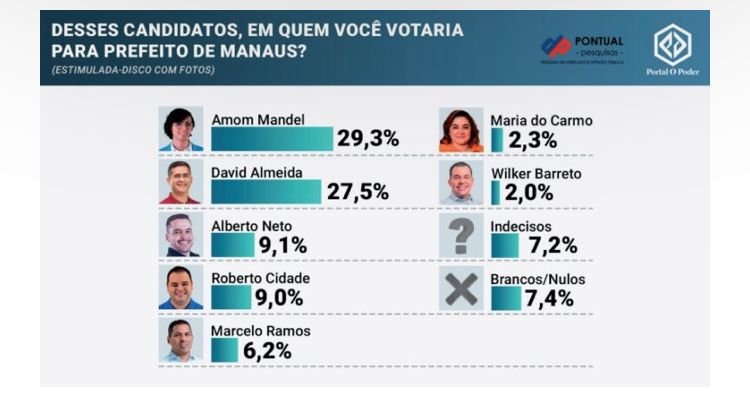 Os dados são referentes a pesquisa estimulada, quando o nome dos pré-candidatos são citados aos entrevistados. Ainda de acordo com o levantamento, logo após Amom e David, aparecem, respectivamente, o deputado federal Capitão Alberto Neto (PL), com 9,1% e o presidente da Assembleia Legislativa do Amazonas (Aleam), deputado Roberto Cidade (UB), com 9%.