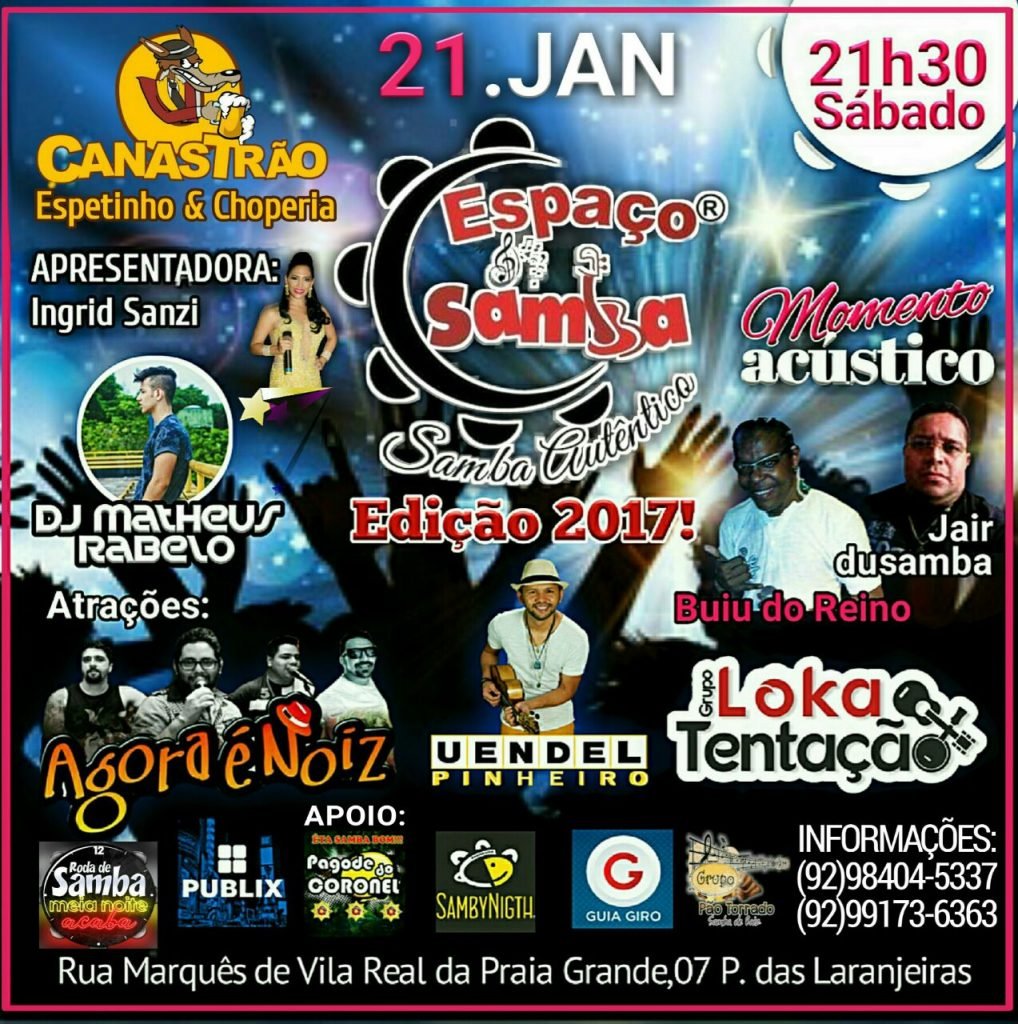 Há oito anos o Espaço Samba conquistou o coração dos sambistas manauaras e por alguns meses o mesmo estava desativado, mas a pedido de amigos e clientes, o proprietário Popó Guedes resolveu reativar o evento, e dia 21 de janeiro vai rolar a edição 2017 do “Espaço Samba” que apresentará o melhor do gênero musical no Canastrão Espetinho & Choperia.
