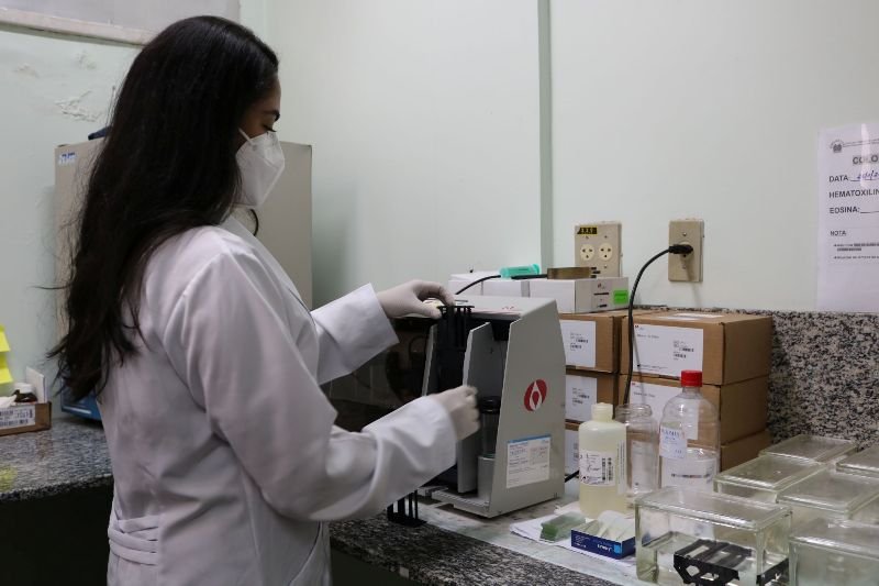 Um dos equipamentos, instalado no último mês de abril, é o processador automático de tecidos, que foi adquirido por R$ 219,2 mil. Segundo a gerente do Laboratório de Patologia da FCecon, médica patologista Sharala Kumari, o processamento dos exames ocorria de forma semiautomatizada, o que levava um tempo maior para o preparo de cada amostra até a análise das lâminas pelo médico patologista.