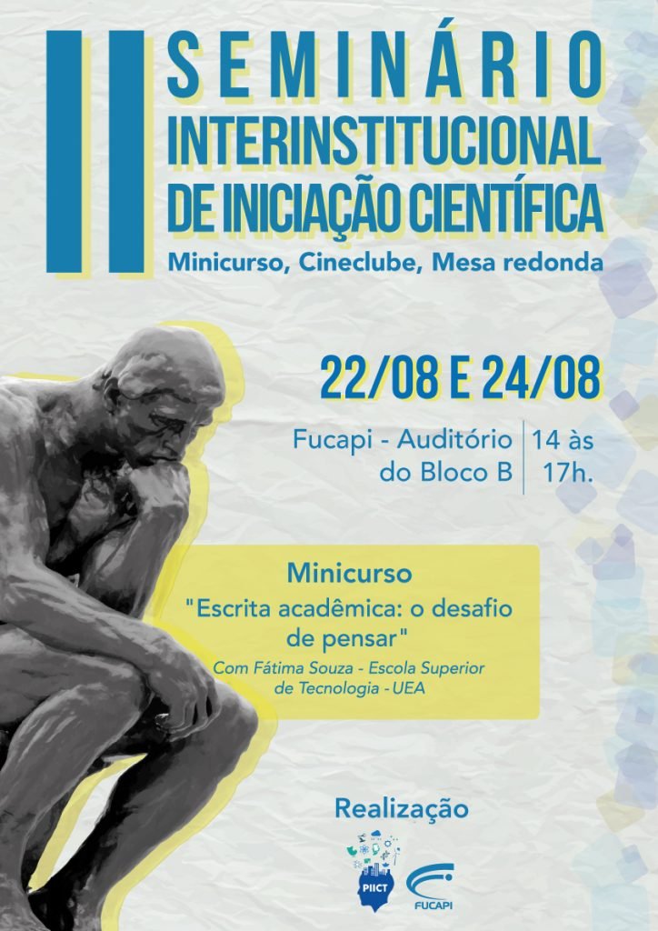 A Faculdade Fucapi vai promover o 2º Seminário Interinstitucional de Iniciação Científica nos dias 22 e 24 de agosto, das 14h às 17h. O evento é livre para todos os acadêmicos interessados em Manaus e terá como tema ‘Escrita acadêmica: o desafio de pensar’. A inscrição é feita pelo site oficial no link https://goo.gl/fkLBdY.