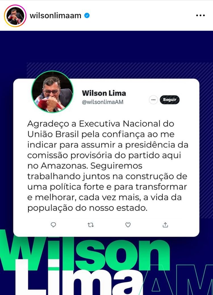 O governador Wilson Lima anunciou, nesta terça-feira, 9, que assumiu a presidência da Comissão Provisória do União Brasil no Amazonas. A sigla estava sem presidente no Estado desde que o agora deputado federal Pauderney Avelino deixou o cargo em maio do ano passado.