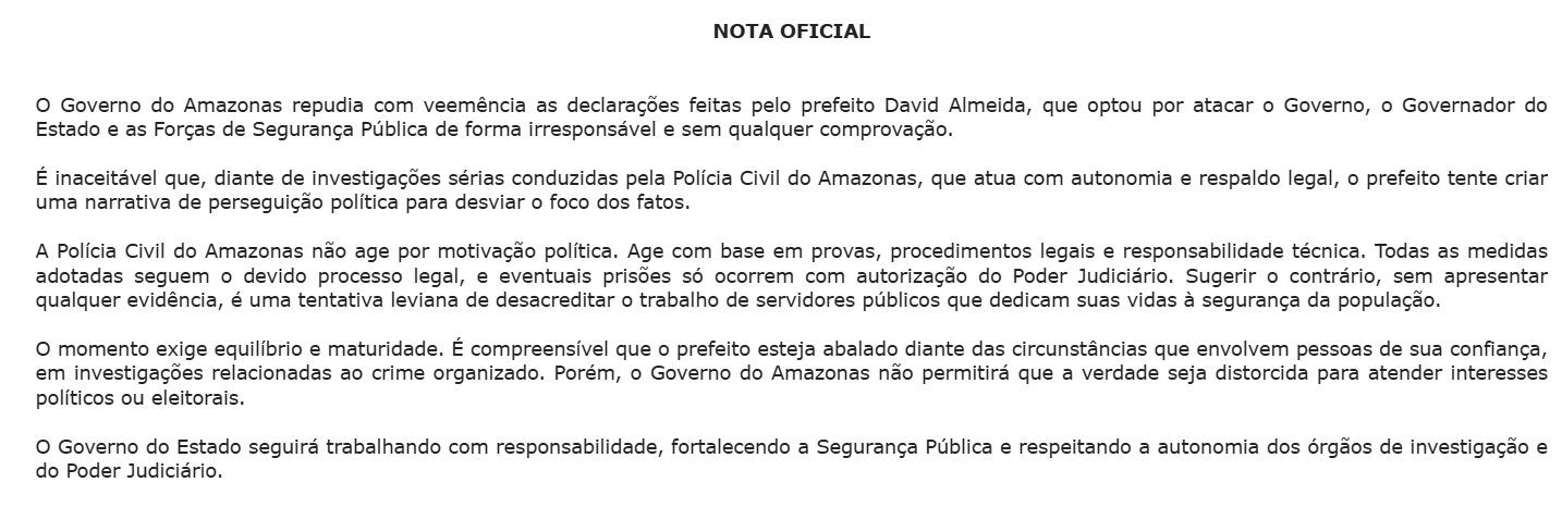 “O Governo do Amazonas repudia com veemência as declarações feitas pelo prefeito David Almeida, que optou por atacar o Governo, o Governador do Estado e as Forças de Segurança Pública de forma irresponsável e sem qualquer comprovação. É inaceitável que, diante de investigações sérias conduzidas pela Polícia Civil do Amazonas, que atua com autonomia e respaldo legal, o prefeito tente criar uma narrativa de perseguição política para desviar o foco dos fatos”, diz a nota do Governo do Amazonas. Veja a nota: