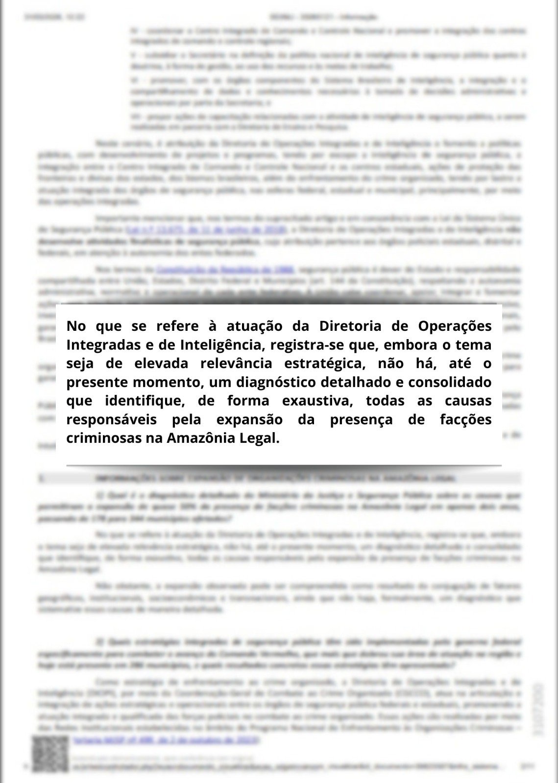 Embora o Ministério cite investimentos e operações, a resposta não aponta resultados concretos na contenção do crime. Para o deputado, o cenário é de expansão territorial das organizações criminosas diante da ausência do Estado.