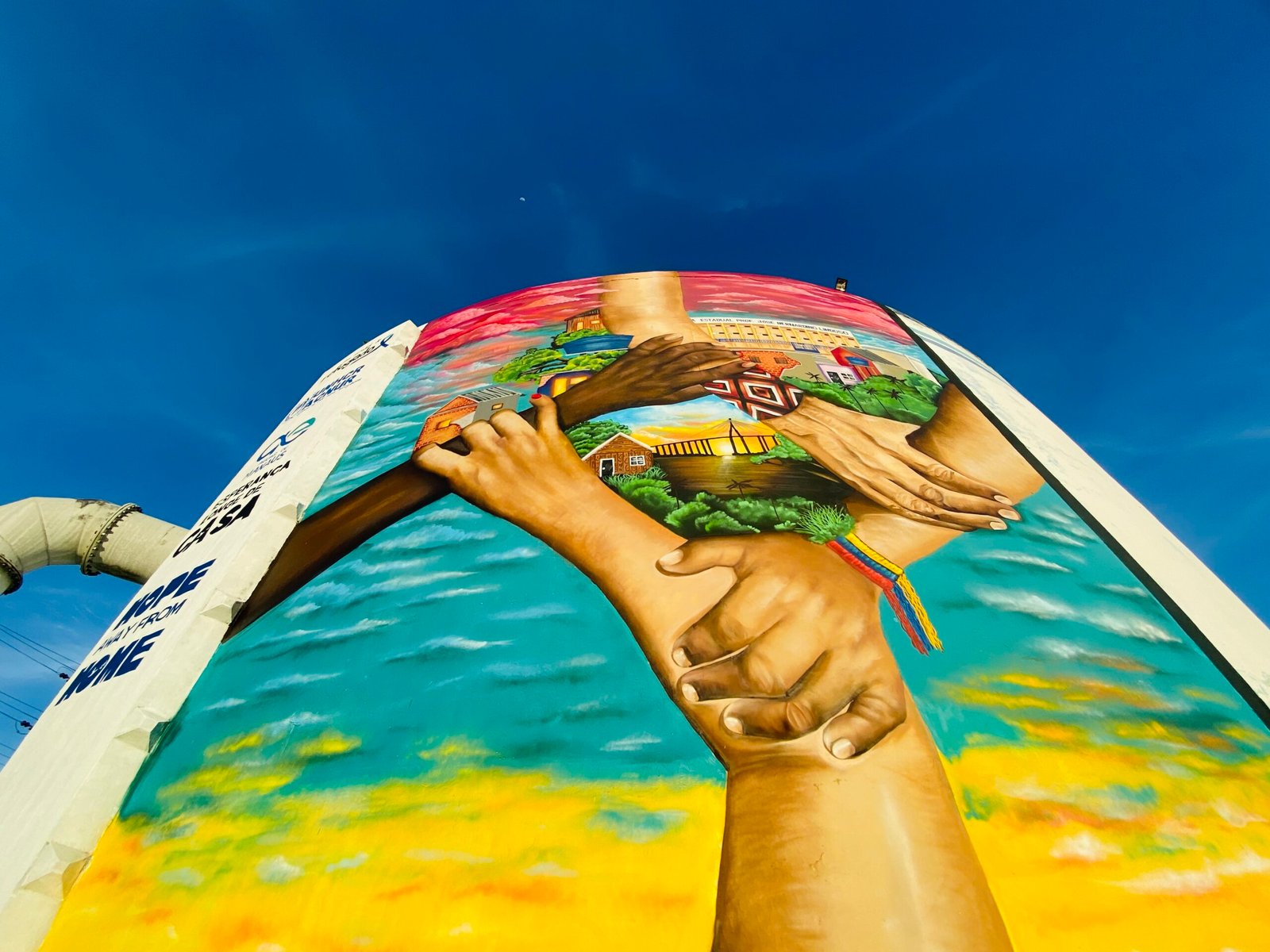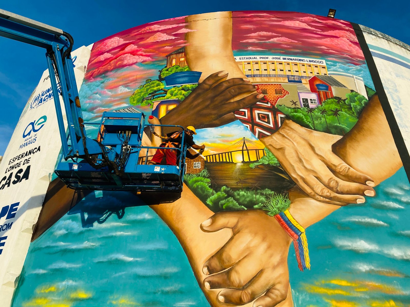A presença de diferentes culturas em Manaus ilustra o novo grafite do reservatório de água localizado na rotatória do Núcleo 23, bairro Cidade Nova, zona Norte da capital amazonense. O trabalho de autoria do artista Denis LDO celebra a pluralidade que marca uma cidade com grande fluxo de refugiados e migrantes, como venezuelanos, haitianos, colombianos e de outras nacionalidades.
