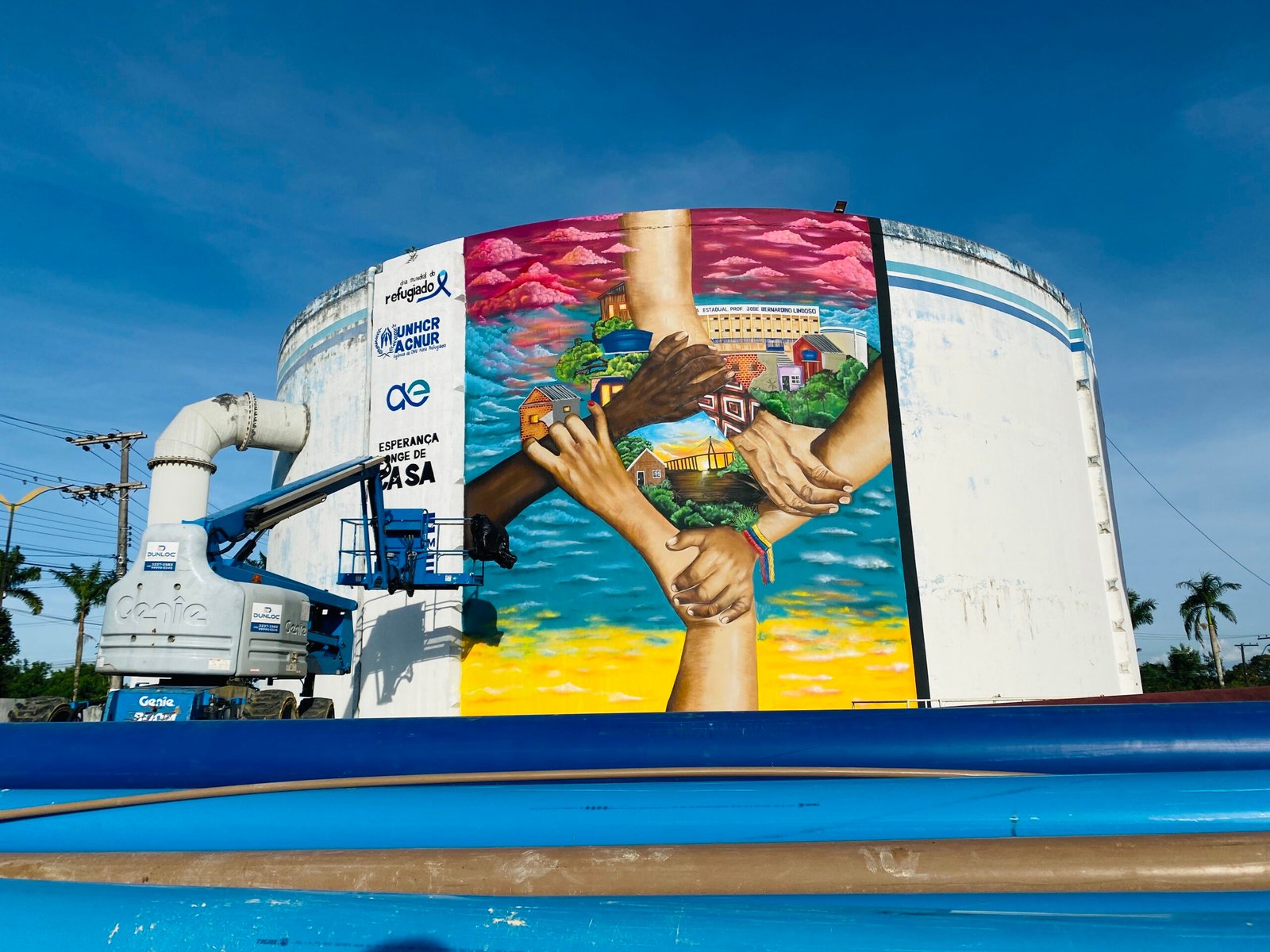 Com o tema “Esperança Longe de Casa”, a arte retrata a inclusão dos refugiados em Manaus, por meio de pessoas de diferentes origens dando as mãos. A hospitalidade é representada por várias formas de habitação existentes na capital. A ação acontece em parceria com a Agência da ONU para Refugiados (ACNUR), no marco do Dia Mundial do Refugiado.