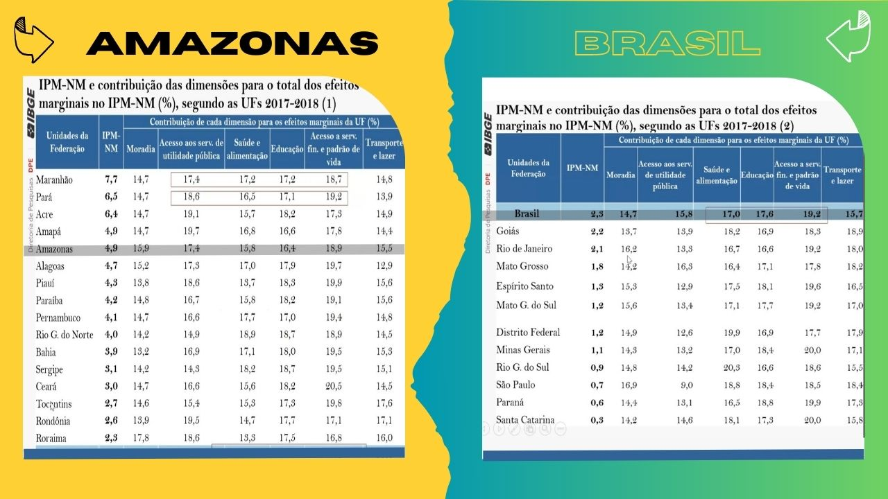 Com índice de 4,9, o Amazonas é o quinto, entre as Unidades da Federação, na perda de qualidade de vida conforme o Índice de Pobreza Multidimensional Não Monetária (IPM- NM). Em primeiro lugar, na mesma análise e período, apareceu o Maranhão ,com 7,7, seguido pelos Estados do Pará (6,5), Acre (6,4) e Amapá (4,9).