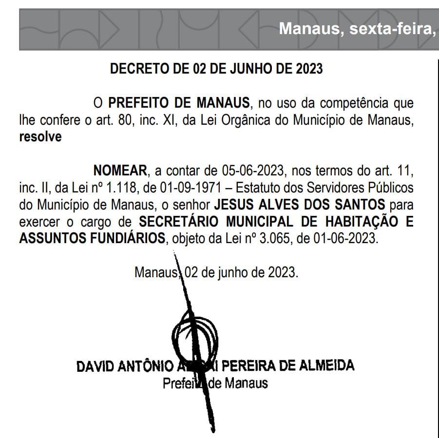 O prefeito de Manaus, David Almeida, assinou a nomeação do empresário Jesus Alves dos Santos, para titular da pasta de Habitação e Assuntos Fundiários (Semhaf). O decreto está publicado no Diário Eletrônico Municipal (DOM) desta sexta-feira (02).