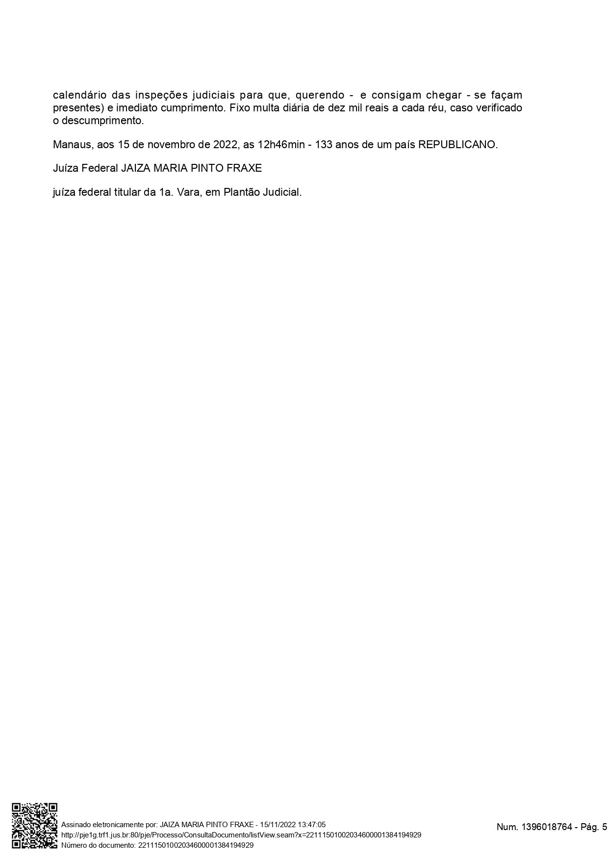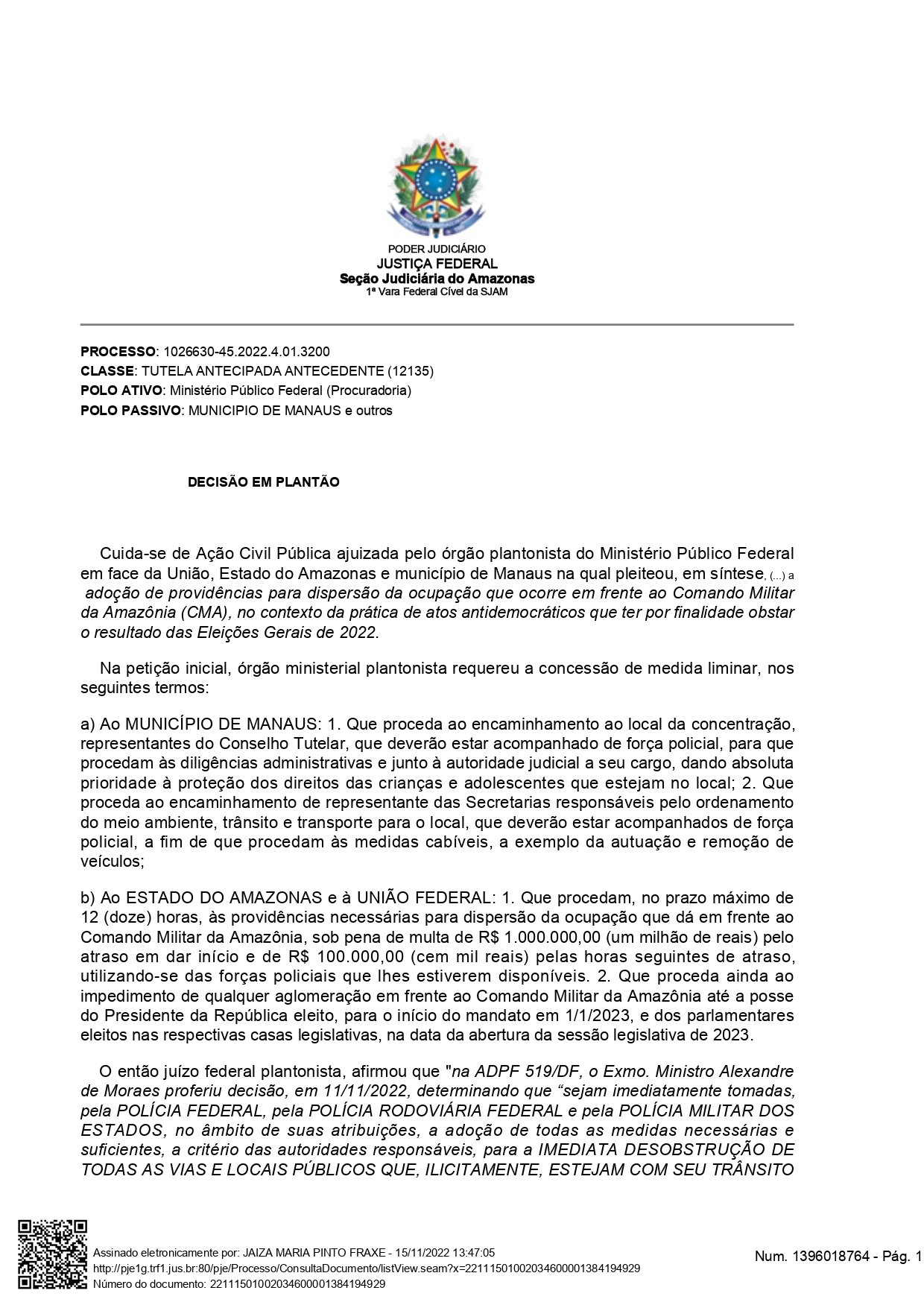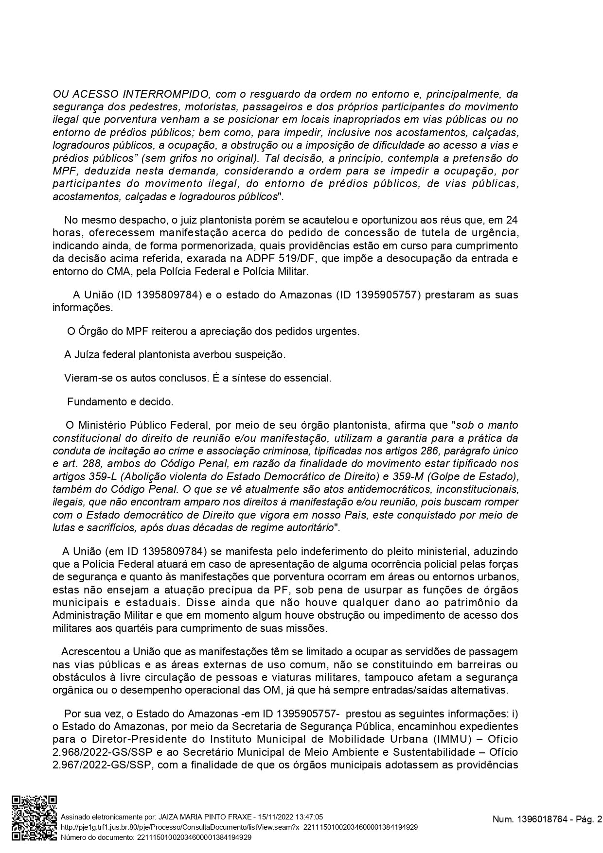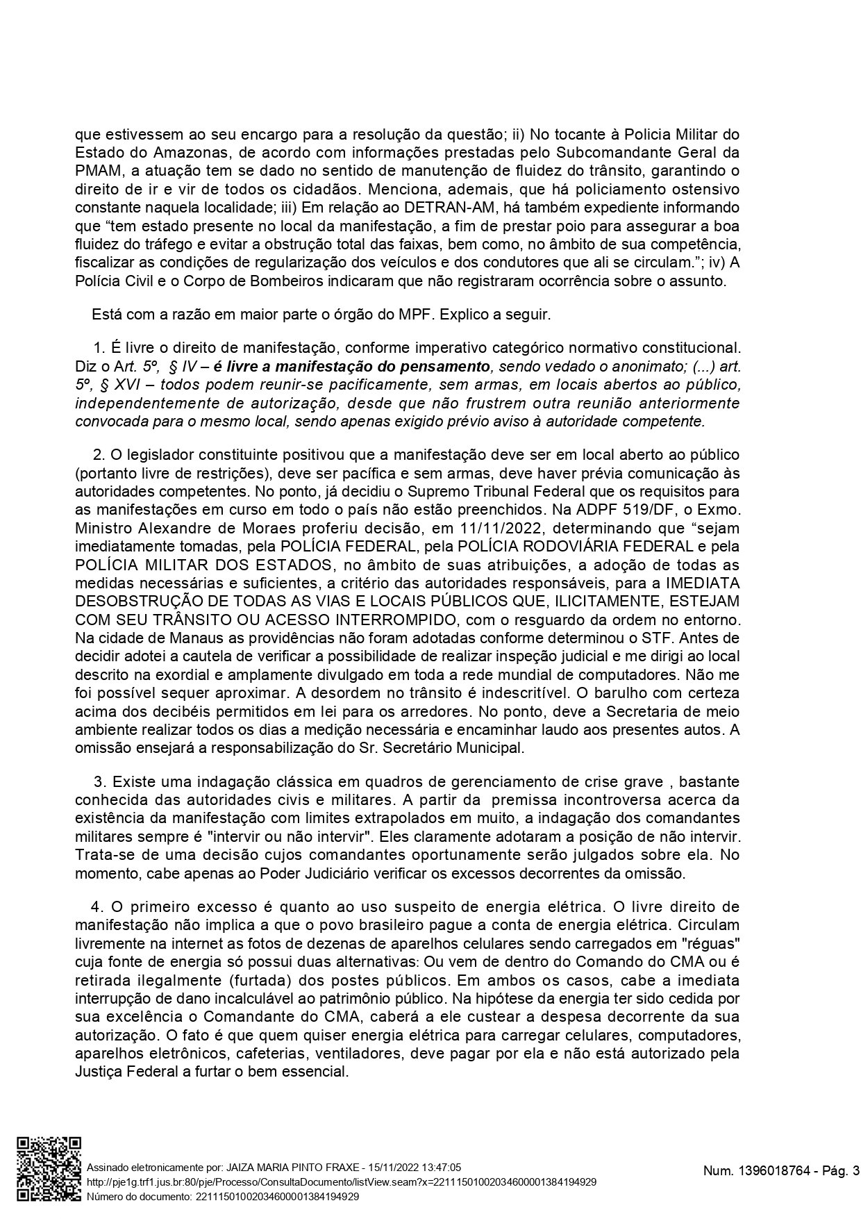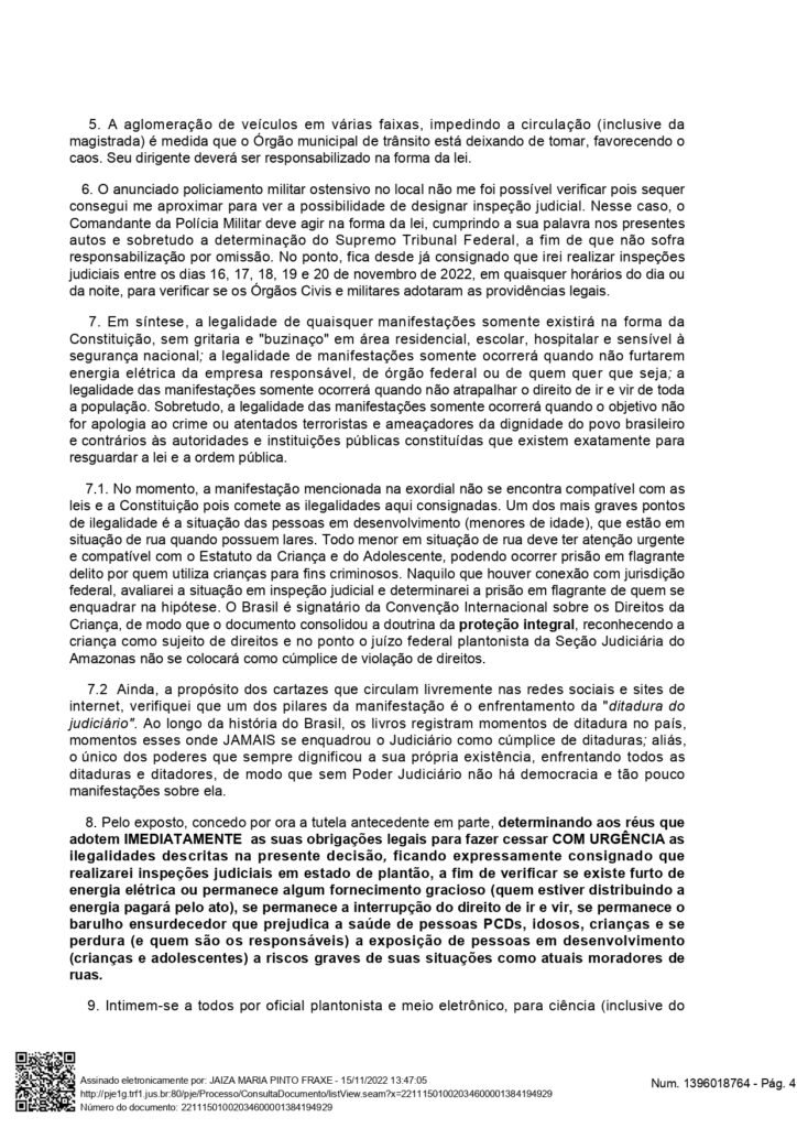 “No momento, a manifestação mencionada na exordial não se encontra compatível com as leis e a Constituição pois comete as ilegalidades […]. Um dos mais graves pontos de ilegalidade é a situação das pessoas em desenvolvimento (menores de idade), que estão em situação de rua quando possuem lares. Todo menor em situação de rua deve ter atenção urgente e compatível com o Estatuto da Criança e do Adolescente, podendo ocorrer prisão em flagrante delito por quem utiliza crianças para fins criminosos. Naquilo que houver conexão com jurisdição federal, avaliarei a situação em inspeção judicial e determinarei a prisão em flagrante de quem se enquadrar na hipótese”, diz parte da decisão da juíza.