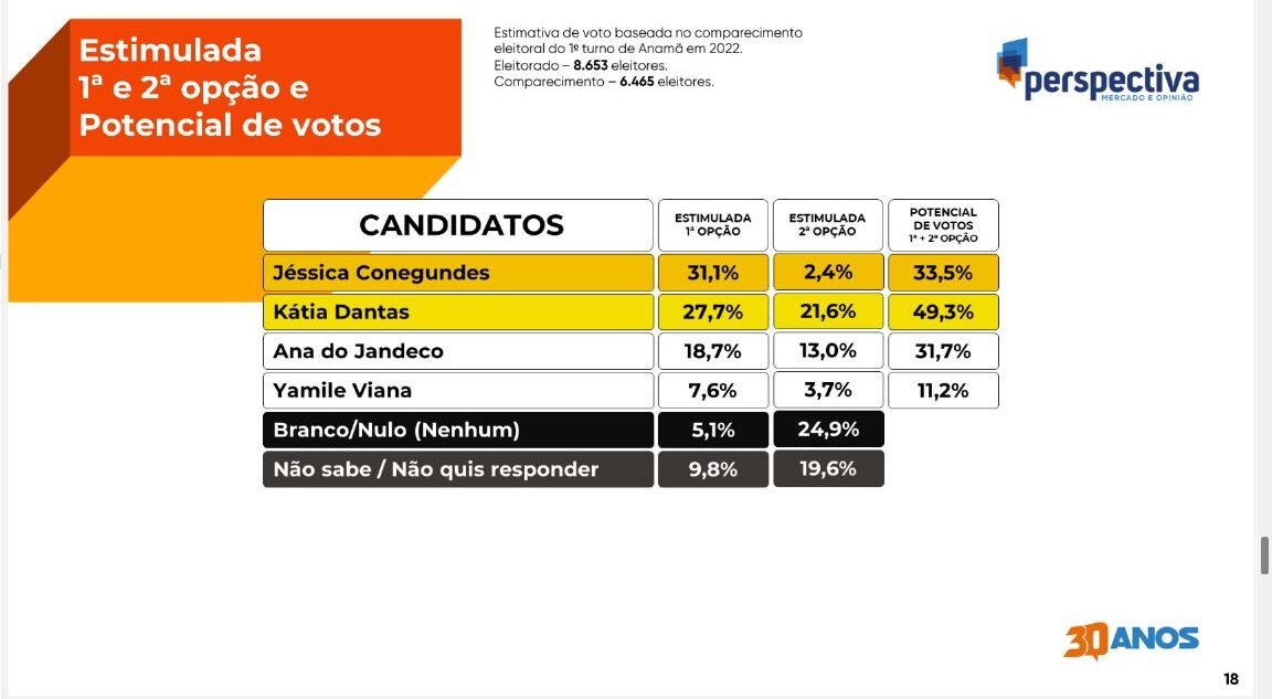 Na estimulada Ana do Jandeco fica com 18,7% enquanto yamile Viana marca 7,6%. Na soma das estimuladas, Ana do Jandeco fica com 31,7% enquanto Yamile com 11,2%