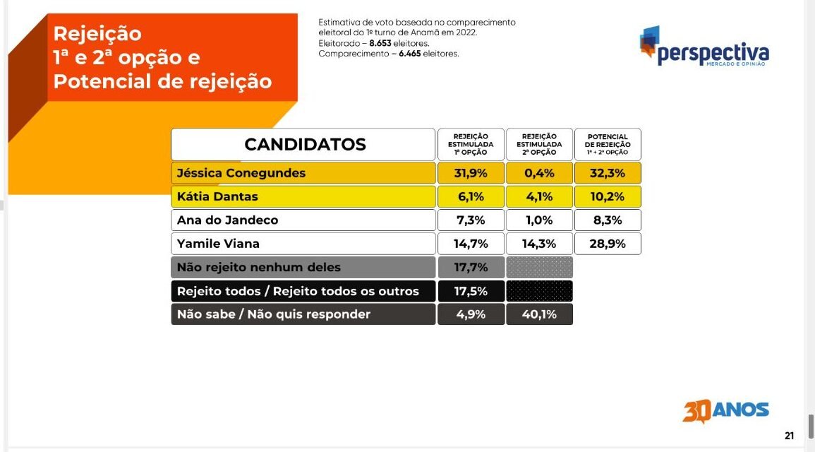 A maior rejeição do eleitorado de Anamã caiu sobre a vereadora Jéssica Conegundes. De acordo com o levantamento da Perspectiva, a vereadora é rejeitada por 31,9% dos eleitores de Anamã. Em seguida aparece Yamile Viana com 14,7% de rejeição. Ana do Jandeco tem 7,3% de rejeição. A menor rejeição fica com Kátia Dantas com 6,1%.