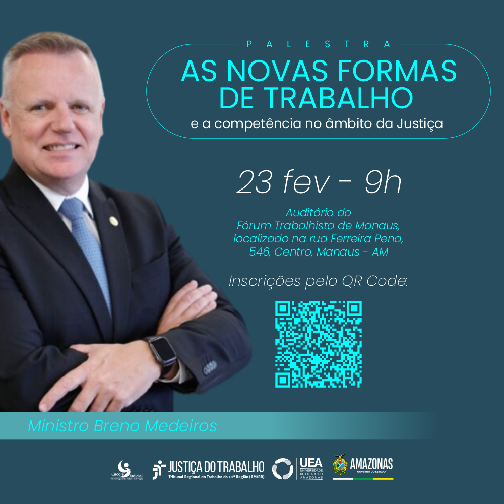 “As novas formas de trabalho e a competência no âmbito da Justiça” será o tema da palestra realizada pelo ministro do Tribunal Superior do Trabalho (TST) Breno Medeiros. O evento é correalizado pelo Tribunal Regional do Trabalho da 11ª Região (AM/RR) e Universidade do Estado do Amazonas (UEA), no dia 23 de fevereiro, às 9h, no auditório do Fórum Trabalhista de Manaus (AM), localizado na rua Ferreira Pena, 546, Centro.