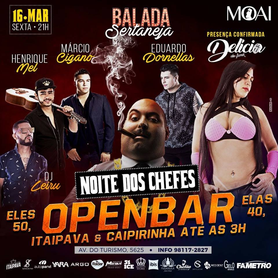 A primeira edição da “Noite dos Chefes” vai acontecer nesta sexta, dia 16, no Moai Restobar, na Avenida do Turismo, 5625, Tarumã, a partir das 21h. O evento irá contar com as presenças de Henrique mel, Márcio Cigano, Eduardo Dornellas e ainda a “Delícia” do Funk. Nos intervalos, o DJ Leirú assume o comando da pista de dança.