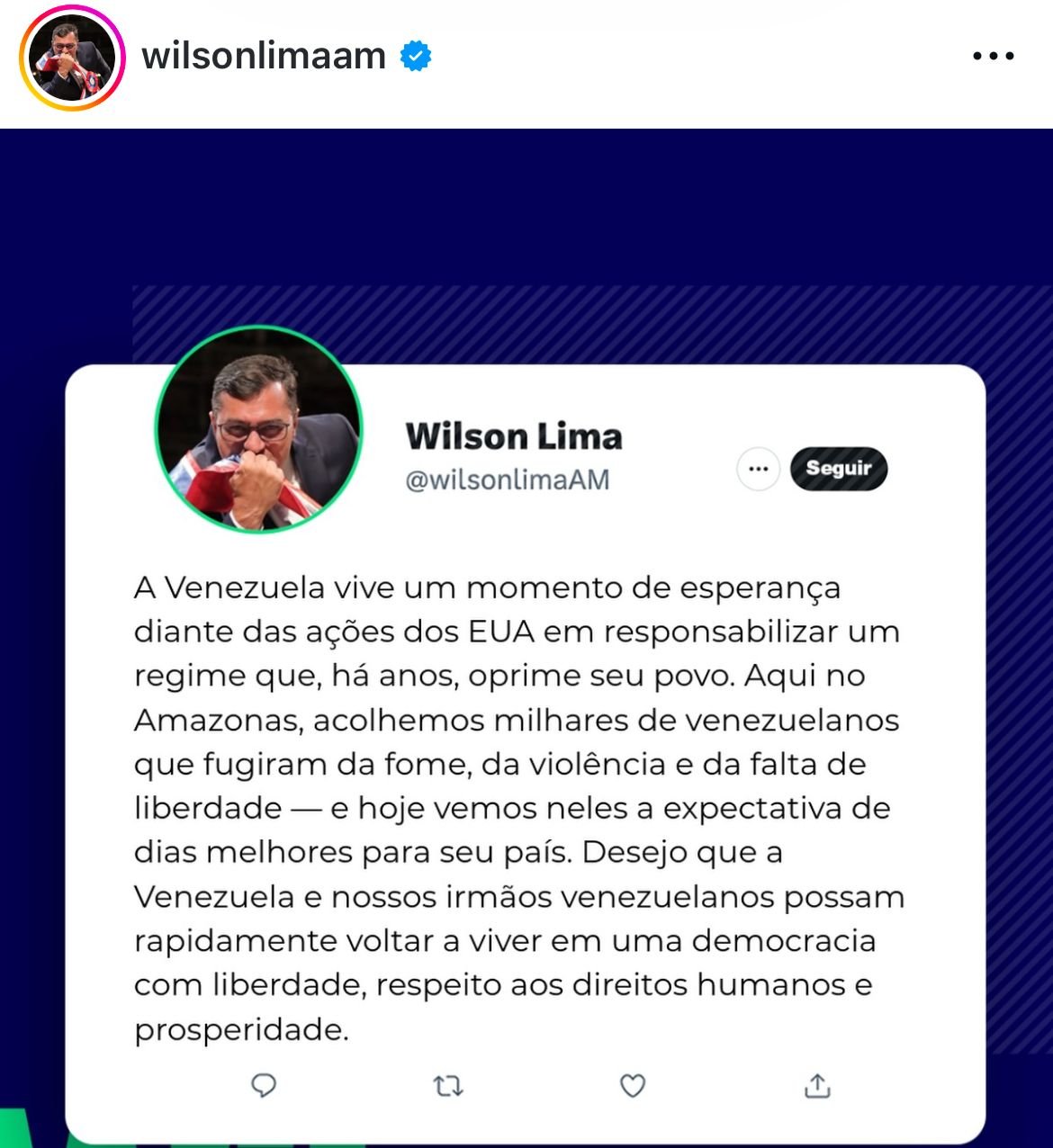> “A Venezuela vive um momento de esperança diante das ações dos EUA em responsabilizar um regime que, há anos, oprime seu povo. Aqui no Amazonas, acolhemos milhares de venezuelanos que fugiram da fome, da violência e da falta de liberdade — e hoje vemos neles a expectativa de dias melhores para seu país. Desejo que a Venezuela e nossos irmãos venezuelanos possam rapidamente voltar a viver em uma democracia com liberdade, respeito aos direitos humanos e prosperidade”, afirmou o governador.