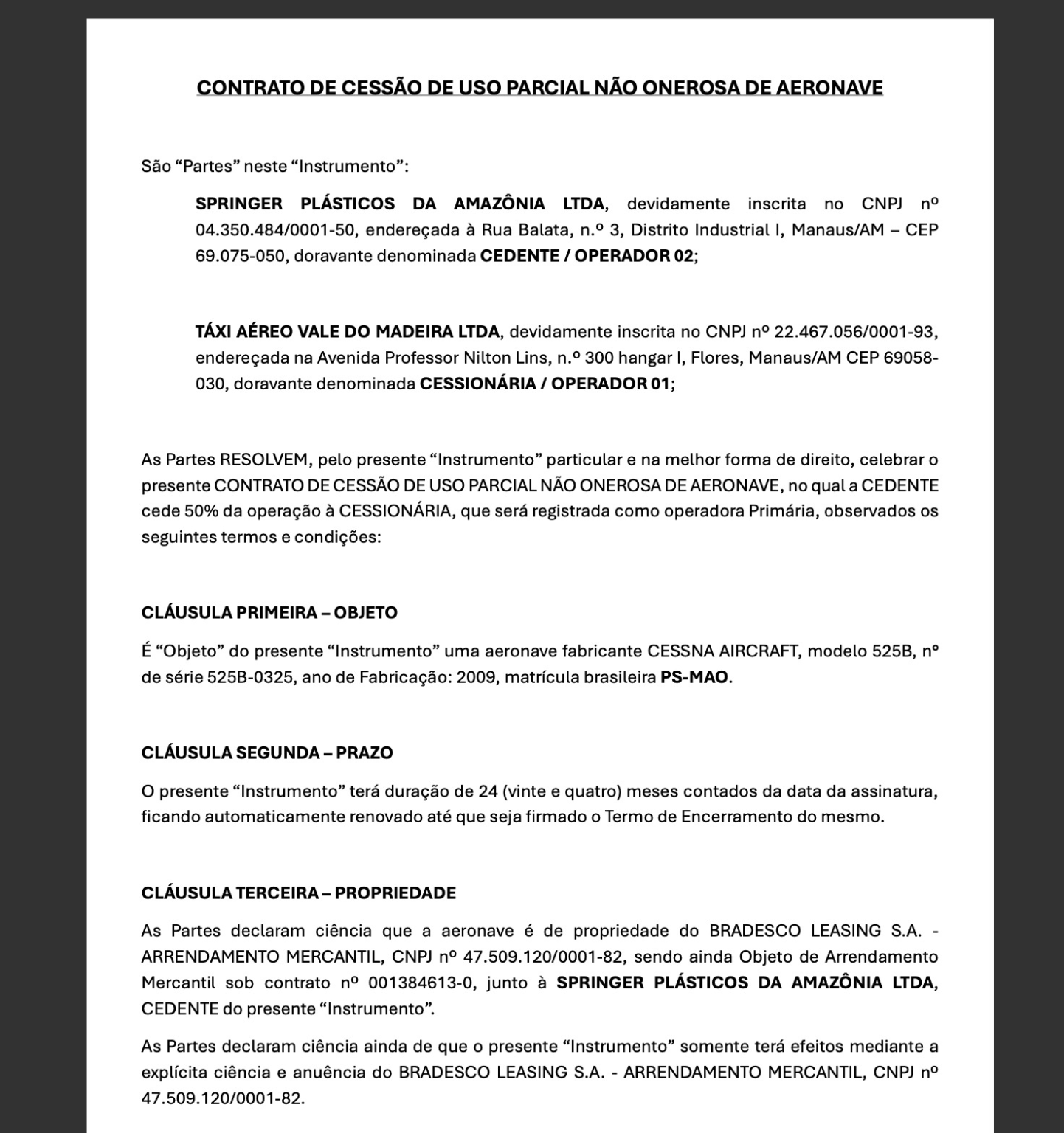 Em meio à repercussão sobre a viagem do secretário da Prefeitura de Manaus ao interior do Estado, um documento obtido e analisado revela que o avião citado, um Cessna Aircraft, modelo 525B, matrícula PS-MAO, fabricado em 2009, está vinculado a um Contrato de Cessão de Uso Parcial Não Onerosa de Aeronave firmado entre a empresa Springer Plásticos e a Tavam.