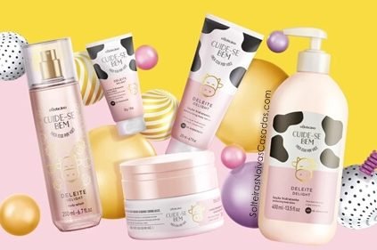O lançamento abusa da fofura nas embalagens, que trazem uma simpática vaquinha – presente em todas as bisnagas, frascos e até mesmo no nécessaire que promete ir para a todas as wish lists. Cuide-se Bem Deleite conta com creme hidratante corporal, com textura supercremosa, loção hidratante, body splash, creme para as mãos e sabonete em barra.