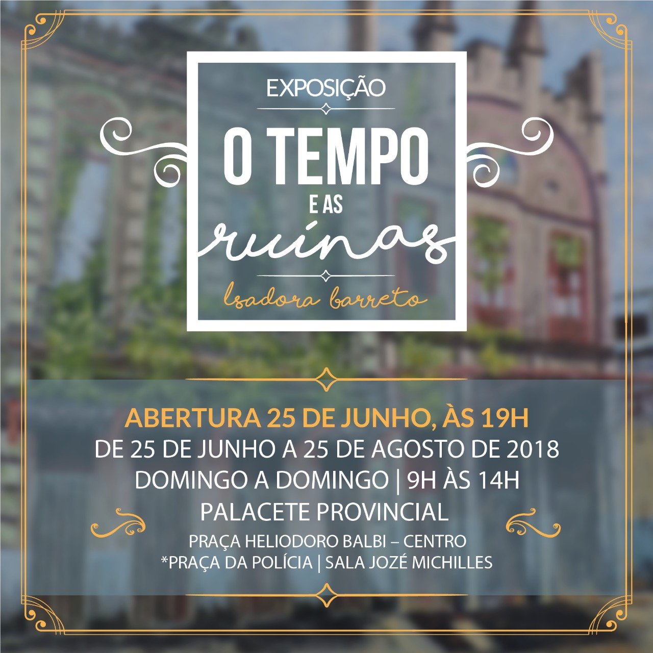 Pinturas de imóveis do Centro, zona sul de Manaus, podem ser conferidas de 25 (segunda-feira) de junho a 25 (sábado) de agosto na exposição “O Tempo e As Ruínas”, da artistas plástica Isadora Barreto de Sousa, na sala José Bernardo Micheles, no Palacete Provincial, na praça Heliodoro Balbi, no Centro, zona sul de Manaus. O vernissage será no dia 25, a partir das 19h.