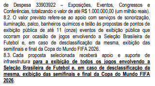 MANAUS (AM) – A Prefeitura de Manaus publicou no Diário Oficial do Município (DOM) de 16 de abril de 2026 o Edital de Chamada Pública nº 001/2026, que prevê investimento de R$ 1.000.000,00 para apoiar eventos de exibição da Copa do Mundo FIFA 2026. O recurso será utilizado na contratação de estrutura para até 11 propostas em diferentes pontos da cidade, sem repasse direto de dinheiro aos organizadores. O apoio será executado pela Manauscult, com base no Programa de Trabalho 13.392.0084.2122 e na Natureza de Despesa 33903922, que abrange serviços voltados a eventos.