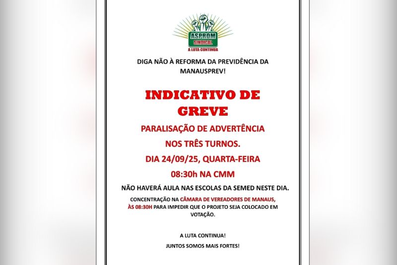 MANAUS — O AspromSindical (Sindicato de Professores e Pedagogos de Manaus) confirmou paralisação de advertência” nesta quarta-feira (24), em protesto contra o Projeto de Reforma da Previdência da Prefeitura de Manaus. Segundo o sindicato, não haverá aulas nos três turnos das escolas municipais.