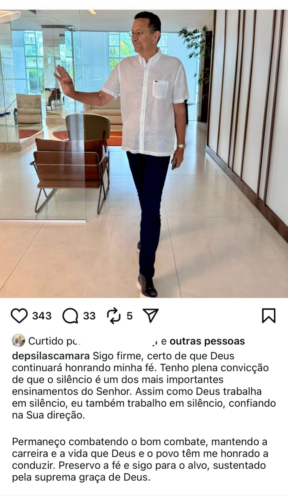 O deputado federal e pastor Silas Câmara (Republicanos–AM) se pronunciou publicamente, na manhã desta quarta-feira (3), após a repercussão das acusações feitas por sua esposa, a deputada federal Antônia Lúcia (Republicanos–AC), nas redes sociais. Sem responder diretamente aos relatos divulgados pela parlamentar, Silas publicou uma mensagem em seu perfil no Instagram enfatizando que continuará mantendo o silêncio.