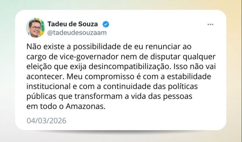 Tadeu reforçou que a prioridade é garantir a continuidade das políticas públicas e a estabilidade administrativa no estado, sem mudanças no atual cenário político. “Não existe a possibilidade de eu renunciar ao cargo de vice-governador nem de disputar qualquer eleição que exija desincompatibilização. Isso não vai acontecer. Meu compromisso é com a estabilidade institucional e com a continuidade das políticas públicas que transformam a vida das pessoas em todo o Amazonas”, declarou.