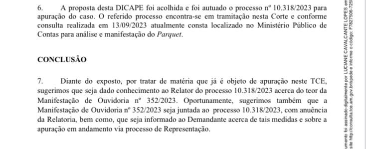 “A proposta desta Dicape foi acolhida e foi autuado o processo n° 10.318/2023 para apuração do caso. O referido processo encontra-se em tramitação nesta Corte e conforme consulta realizada em 13/09/2023 atualmente consta localizado no Ministério Público de Contas para análise e manifestação do Parquet”, diz trecho do documento.