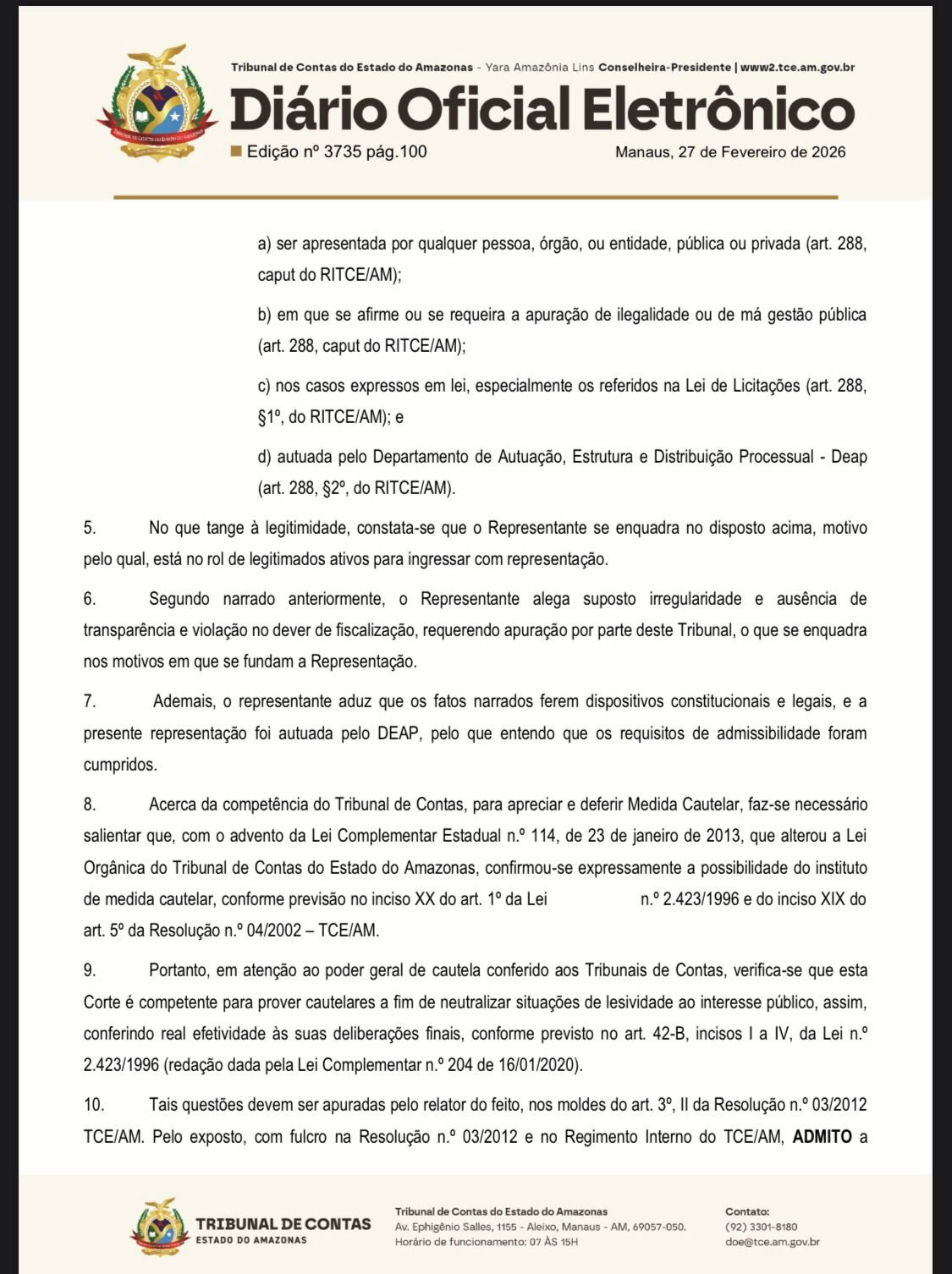Com a admissibilidade da representação, o TCE-AM poderá determinar diligências, solicitar documentos e abrir investigação mais aprofundada para apurar fatos e definir se houve irregularidades administrativas ou omissões no cumprimento das normas de transparência.