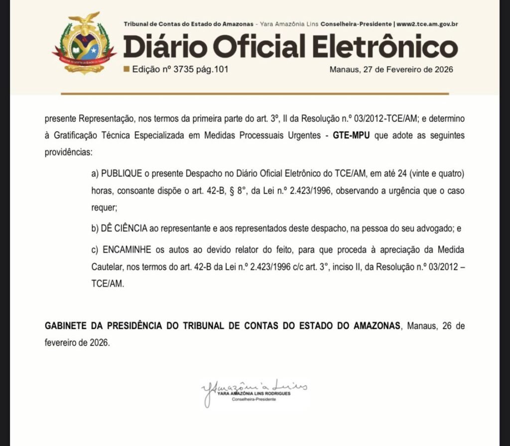 O relator do processo é o próprio vereador José Ricardo Wendling (PT), eleito ao pleito municipal no ano de 2024. A partir da admissibilidade, a administração municipal foi notificada para apresentar esclarecimentos no prazo estipulado pelo TCE-AM.