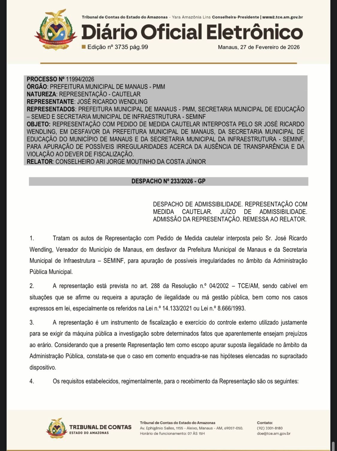 O Tribunal de Contas do Estado do Amazonas (TCE-AM) admitiu na última quinta-feira, 26, representação do vereador José Ricardo Wendling (PT) para apurar possíveis irregularidades relacionadas à falta de transparência e ao eventual descumprimento do dever de fiscalização por parte da Prefeitura de Manaus, da Secretaria Municipal de Educação (Semed) e da Secretaria Municipal de Infraestrutura (Seminf), comandada pelo vice-prefeito Renato Júnior. A decisão foi publicada na edição de 27 de fevereiro de 2026 no Diário Oficial Eletrônico.