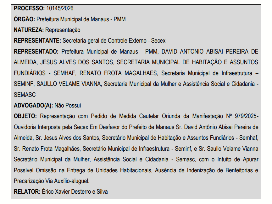 A informação costa no processo 10145/2026, publicado no Diário Oficial Eletrônico do TCE-AM na última quinta-feira, 29. De acordo com a Secretaria-Geral de Controle Externo (Secex), a falta de conclusão das obras e de solução habitacional definitiva deixaram as famílias em situação de vulnerabilidade social. Veja trecho: