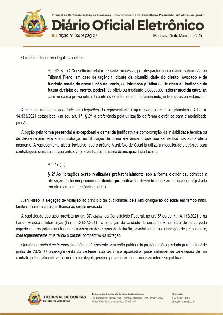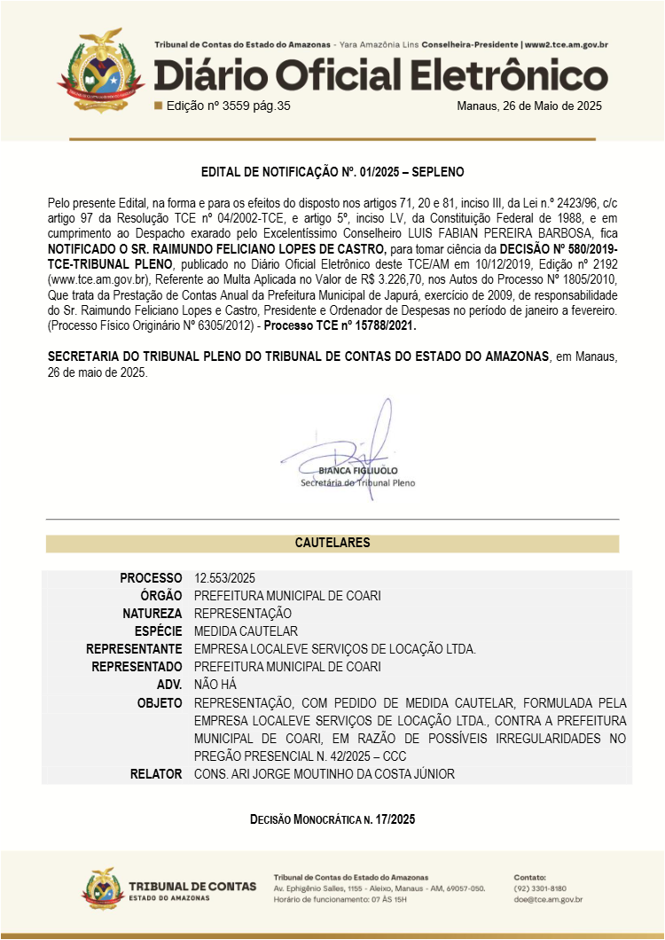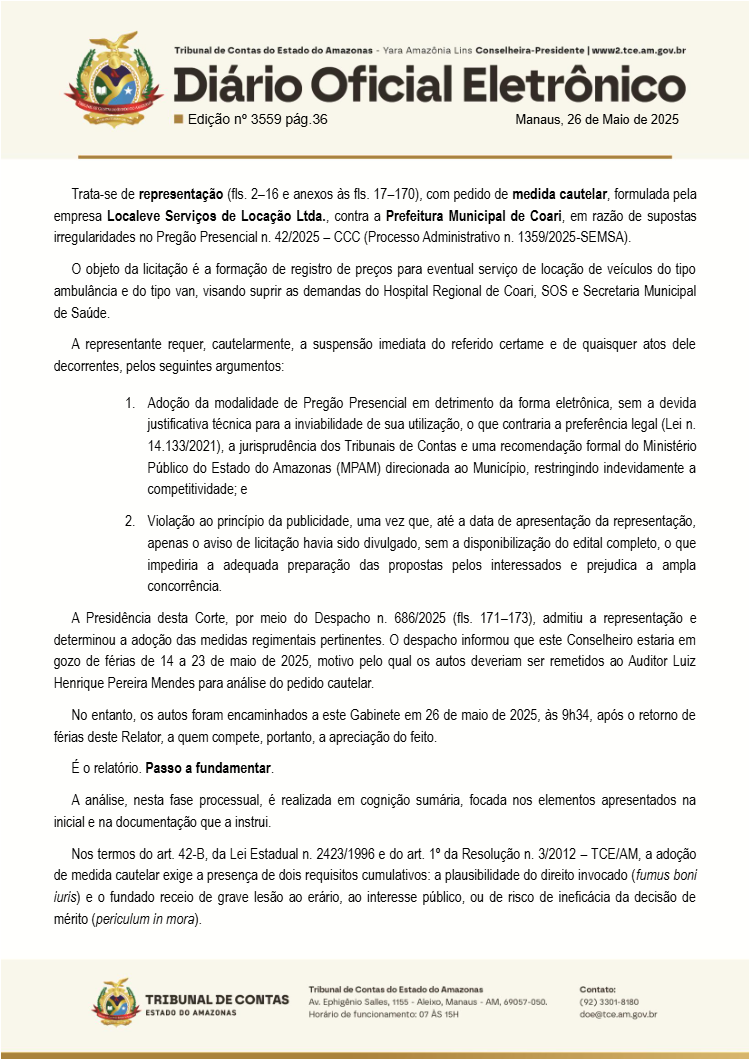 O Tribunal de Contas do Amazonas (TCE-AM) suspendeu urgentemente uma licitação da Prefeitura de Coari, sob a gestão do prefeito Adail Pinheiro, após identificar indícios de manipulação do processo para beneficiar empresas selecionadas. A licitação, que visava alugar ambulâncias e vans, foi barrada pelo conselheiro Ari Moutinho, após denúncia sobre a falta de transparência, o direcionamento e a violação da lei.
