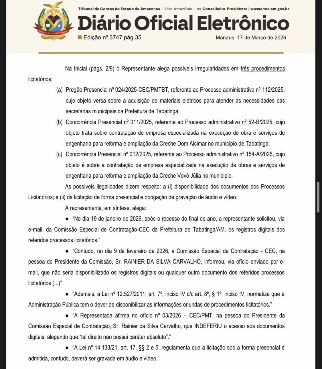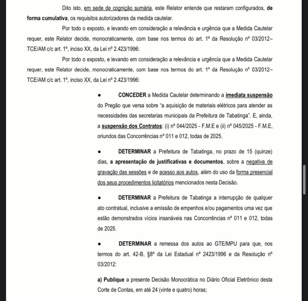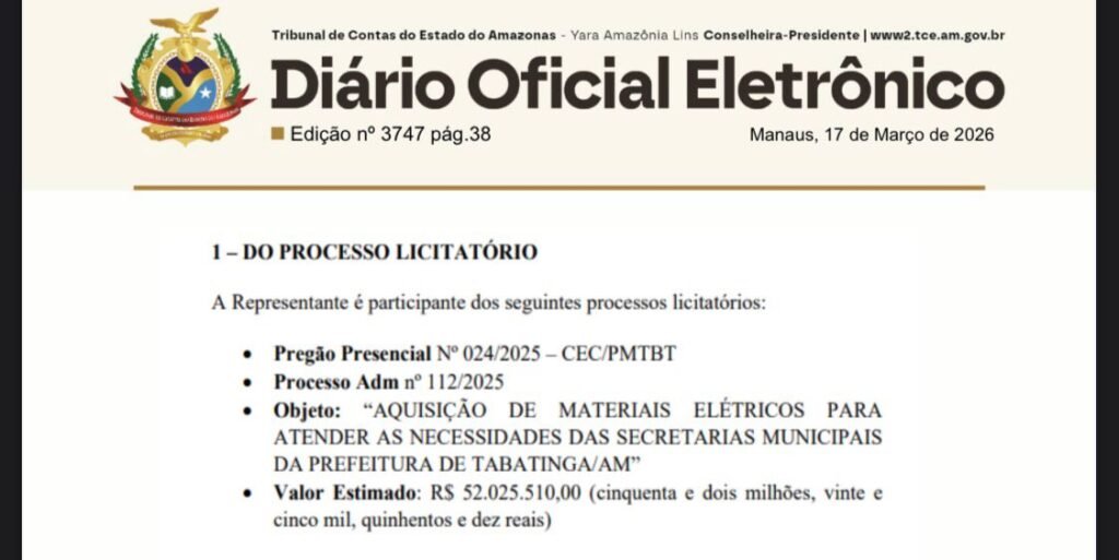 O Tribunal de Contas do Estado do Amazonas (TCE‑AM) determinou a suspensão imediata do pregão de materiais elétricos e dos contratos com SCM Construções Ltda. e Magalhães Construções Ltda., em ação contra a Prefeitura de Tabatinga, sob o comando de Plínio Cruz (Republicanos), após representação da empresa M. C. dos Santos Ltda., que questionou três licitações de alto valor, incluindo uma de mais de R$ 52 milhões. Foi estabelecido também prazo de 15 dias para que sejam apresentadas justificativas e documentos sobre a negativa de acesso aos autos e a ausência de gravação das sessões, conforme publicação no Diário Oficial Eletrônico de 17 de março de 2026.